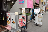 一角にはメイド関連の店舗の看板が密集する地域も。どれに行こうか迷っちゃいます。