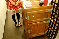 霞娘のキャラクタデザインはもえたんで有名なPOP氏。入り口の受付は古い冷蔵庫です。リフレ併設のためカフェのメニューはお茶やソフトドリンク、カレーライス、甘味が中心と軽食のみですが、接客が非常に丁寧、お見送りはちょっと感動できます。