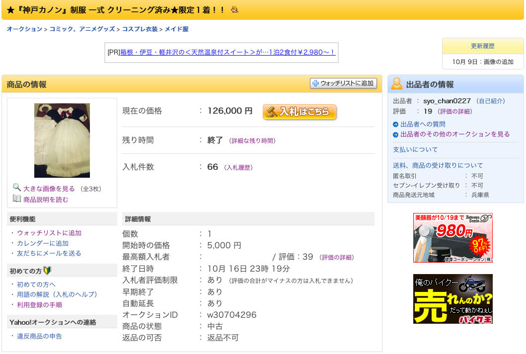 ・ヤフオフで神戸KANONのメイド服が出品、12万6000円で落札