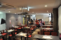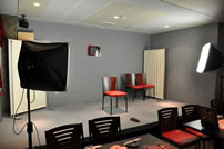 撮影にも使えるステージ(通常はお座敷席としての使用も)、プロジェクタなどイベント開催もOKな施設。電源サービスはこの時点ではまだできていませんでしたが、他の店舗と同様に無線LANと電源の使用がOKになる予定です。