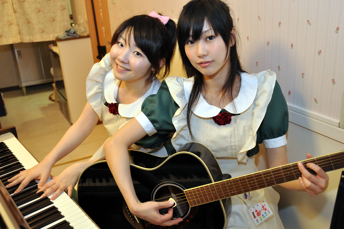 営業時間に楽器の演奏があります。お客さんからのリクエストもOK。このサービスは旧めいどinじゃぱんに似ていますが、店内BGM、楽器演奏ともクラシックが多く、落ち着いた感じが出ています。お店の設定では「チームお姉さま」「チーム妹」に分かれているようで写真は妹チームのメイドさん。制服はキャンフル製。長袖と半そで、スカートにはミニとロングとそれぞれ2種類ありますが、姉妹関係なくそれぞれにチームにミニとロングを着るメイドさんがいるようです。