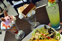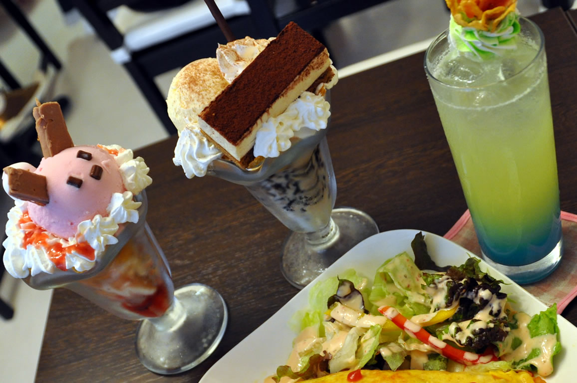 お店の主力メニューとなりそうな妹パフェ、姉パフェ、オリジナルカクテル(左)。味は姉、見た目は妹とのことですが、妹パフェもなかなかいけました。メイドカフェでは定番となったオムライスもあります(右)。プレスリリースでは客単価800円となっていましたが、実際にはフードが800円〜、ドリンク500円〜なので客単価はもっと高そうです。変わったものではカレー向けのトッピングで「薔薇の棘(バラのとげ)」。赤唐辛子の10倍以上も辛さの調味料だそうです。