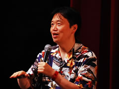 1部のトークライブでは、モデレータにアニメ評論家の氷川竜介さん、パネラーにオタキングこと岡田斗司夫さん、声優の喜多村英梨さん、アニメアニメジャパン代表の数土直志さん、アニメーション監督の高橋良輔さんの4人を迎え、「アニメ愛は国境を越えるか?」というテーマでパネルディスカッションを行った。