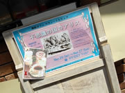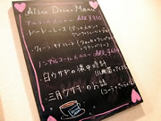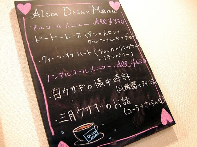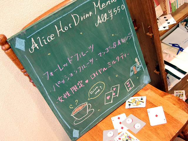 店の前、店内のボードなど。アリスにちなんだイラスト、トランプが使われています。