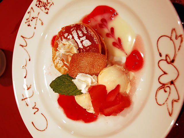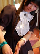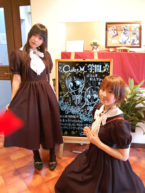 このイベントはCute-M学園での秘密のお茶会ということで、お客さんは学園の3年生、メイドさんが2年生、1年生という設定で、それぞれ参加の印として紅玉(赤)、水晶(白)、翡翠(緑)のリボンを手首につけてお茶会に参加する。挨拶はもちろん「ごきげんよう」。お店の雰囲気、メニュー、接客とも凝っていて、大変優雅に堪能できたお茶会でした。