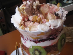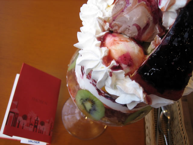 文庫本がかわいく見えるサイズ。 公称では通常のパフェの4倍とのことですが、 サンプル画像をはるかに上回るボリュームで来ました。