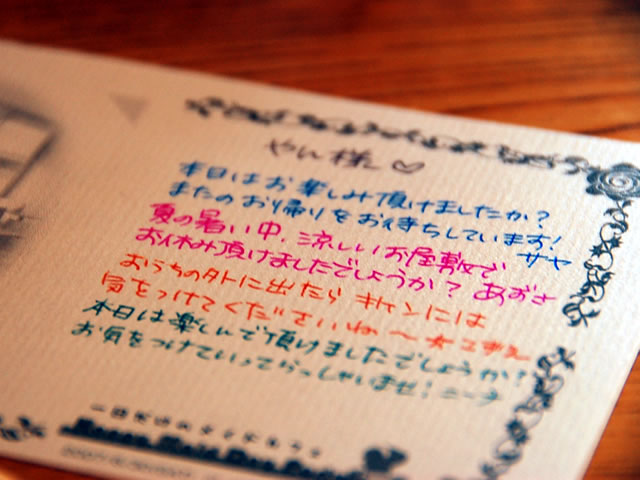 予約者にはメイドさんから手書きのメッセージカードが送られます。これはうれしい!フード・メニュー類は入場セットが1000円でドリンクとケーキが付いてきます。ほかにはパスタやメイドさんの名刺付きオリジナルカクテルなど。また60分の入れ替え制となっていました。通常カフェとして営業しているお店なのでフード類も安心して食べることができます。