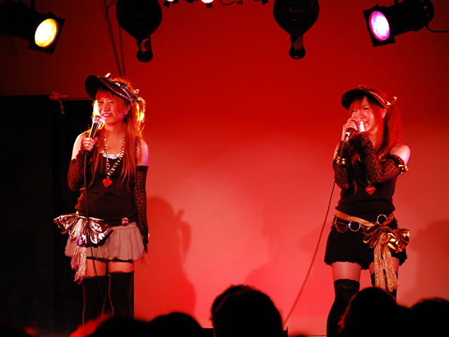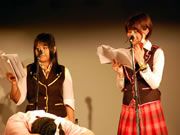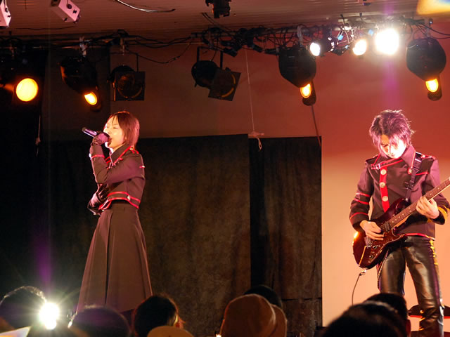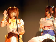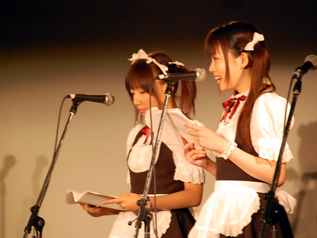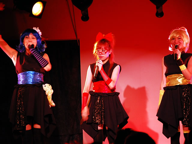 左から、ニハニのメイドさん、ファンシーキャットのメイドさん、ROBO太のメイドロイドさん。舞台は1時間程度。はげ丸のメイド喫茶さんのレポートにもありますが、メイドさんの生足にドキッとしたり、被害者には12人の○がいるという設定だったりと見ていてニヤリというネタが満載で、笑いの絶えない面白い舞台だったと思います。後半はライブです。