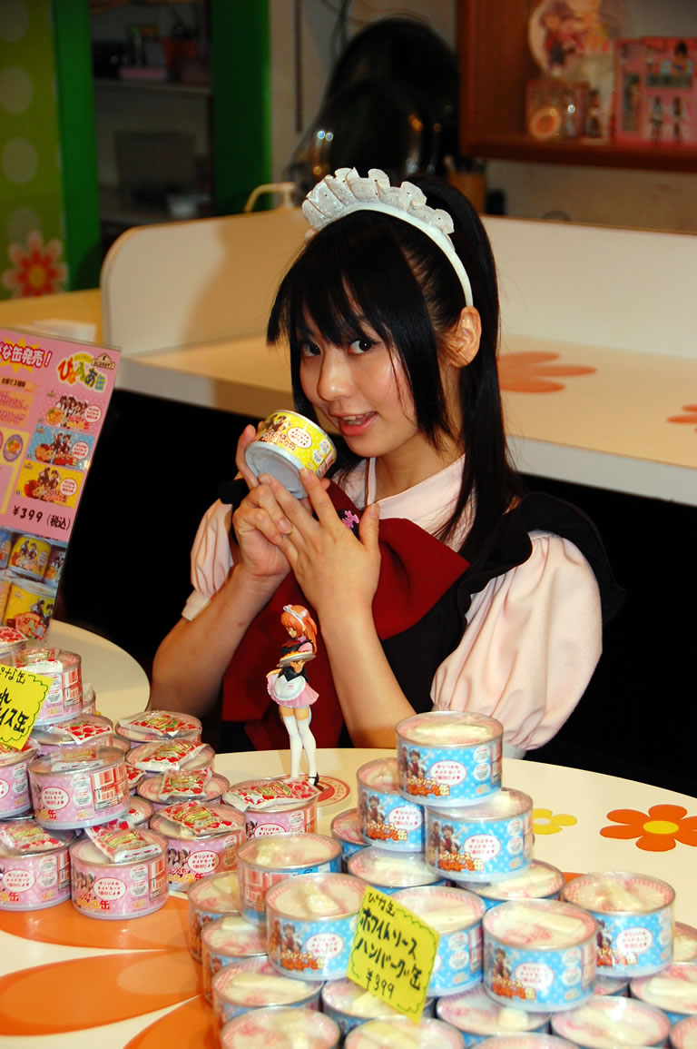 24日、秋葉原のメイドカフェ「ぴなふぉあ」にてオムライスなど同店の人気メニューを缶詰にしたおとなのおやつ「ぴなふぉあ缶」の発売発表会が行われた。