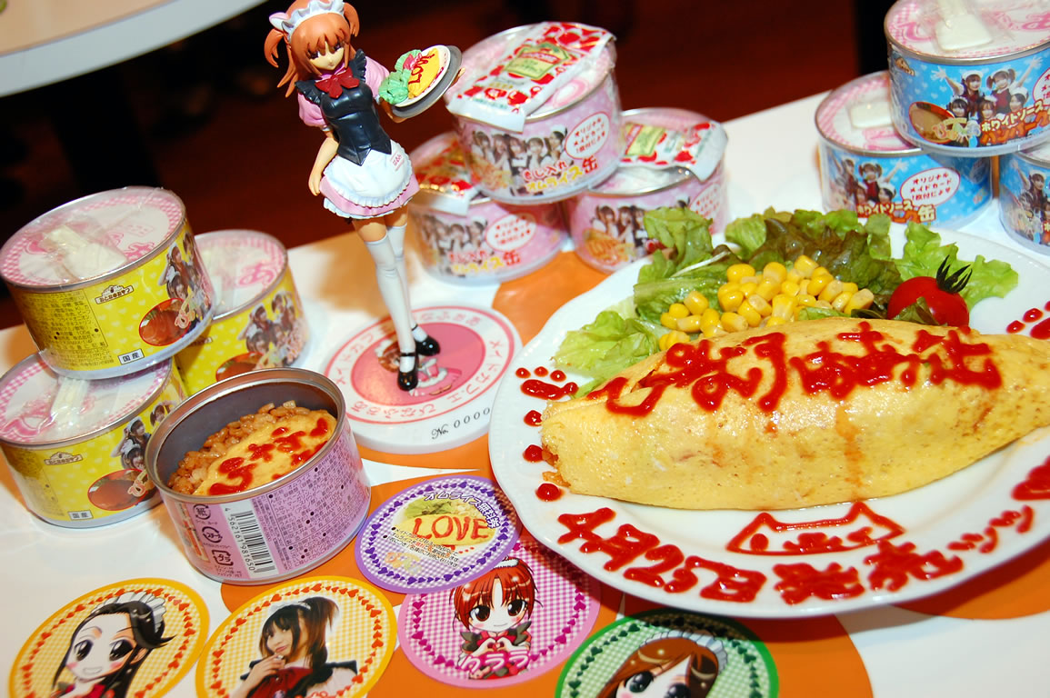 メイドカフェのメニューらしく缶詰にはカフェ店員のカードがおまけとしてつきカードの種類だけ購入してしまうというコレクターズアイテムの側面と、24分の1の確率でオムライス無料券や撮影権が当たるエンタメ性をあわせ持つ。