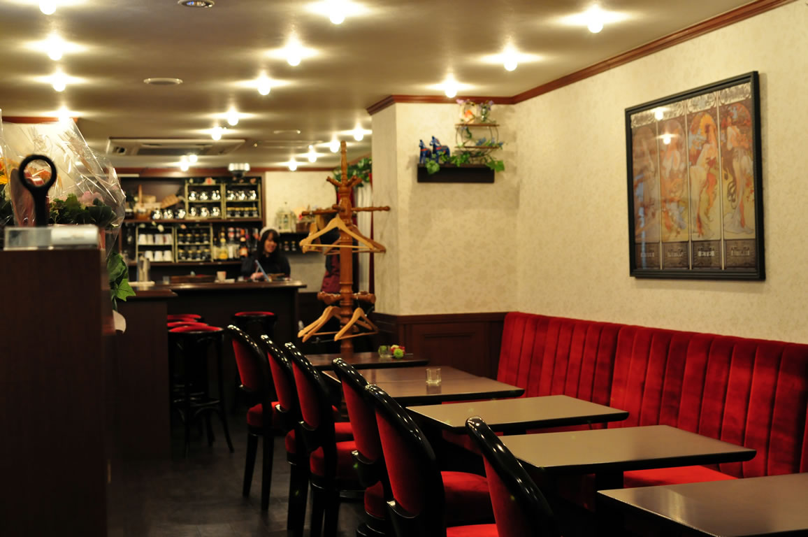 リニューアルのための閉店が3月22日だったので店内の変化はそう多くありません。小物やミュシャの絵が飾られるなど。無線LANや電源の利用は可能で、ソファ席やカウンターには電源の取れる席が用意されています。